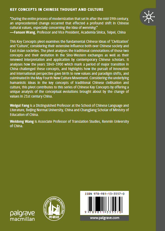 方维规著《中国近现代文明、文化概念(英文版)》由施普林格(Springer)旗下的英国老牌出版社帕尔格雷夫·麦克米兰(Palgrave Macmillan)出版,所属系列为“中华思想文化核心概念丛书”(Key Concepts in Chinese Thought and Culture)。