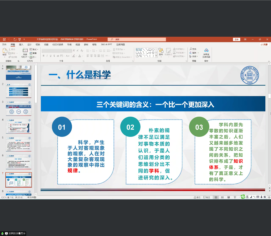 古代汉语教师党支部与2023级硕士第一党支部联合开展共建活动,邀请古代汉语教师党支部的刘利老师主讲线上党课——“向科学精神和科学情怀进阶”。活动由古代汉语教师党支部书记柯永红老师主持,来自2023级、2024级的80余名硕士研究生党员和入党积极分子共同参加了此次党课学习。 刘利老师首先引用《现代汉语词典》对“科学”一词进行解释:科学是反映自然、社会、思维等的客观规律的分科的知识体系。他在定义中提取出“客观规律”“分科”“知识体系”三个关键词,举例说明了其中所隐含的层层递进关系。他进一步指出,人的学习具有阶段性,研究生应结合自身特点,为不同阶段的学习设立目标。 接着,刘利老师阐述了科学活动的三层境界:第一层是在感知和接受中追求科学知识;第二层是在批判与建构中培养科学精神;第三层则是在普及和转化中涵养科学情怀。刘利老师强调,在研究生阶段,同学们应逐渐从知识的接受者转变为建构者和传播者,进入追求科学精神的境界。以传统语言学研究为例,刘利老师论述了如何在批判与建构中培养科学精神。他指出,传统语言学研究正在向计算语言学、病理语言学等交叉学科拓展,这种跨学科的融合正是科学精神中“批判”与“建构”的体现。 刘利老师鼓励同学们不仅要追求科学知识,更要向更高层次的科学境界——科学精神和科学情怀进阶。要从国家战略、社会需求出发,积极思考学习成果的社会应用,通过科学普及和科学转化两种方式,努力实现自己的人生价值。 最后,刘利老师向所有参会同学提出期盼:“科学研究的道路漫长、艰辛,但也充满探索真知的乐趣。未来和希望寄托在年轻人身上,希望同学们永远保持对科学的兴趣和对真理的追求,不忘初心,脚踏实地,用创新促进学术服务社会,成就梦想。”柯永红老师也在总结发言中强调了研究生阶段学习的重要性,并鼓励同学们合理规划学术生涯。他希望同学们将刘利老师的教诲铭记于心,将所学所得转化为实际行动,勇于创新探索,不断追求真理,努力成为具备科学精神和科学情怀的新时代青年。 (图/赵婕妤 文/江韵 翟梅芳)