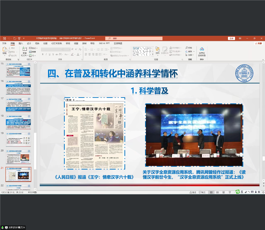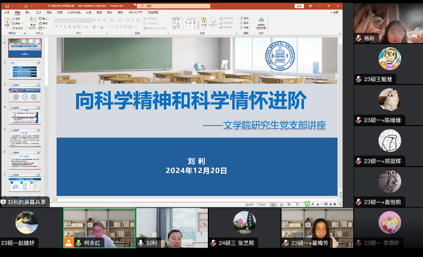 古代汉语教师党支部与2023级硕士第一党支部联合开展共建活动,邀请古代汉语教师党支部的刘利老师主讲线上党课——“向科学精神和科学情怀进阶”。活动由古代汉语教师党支部书记柯永红老师主持,来自2023级、2024级的80余名硕士研究生党员和入党积极分子共同参加了此次党课学习。