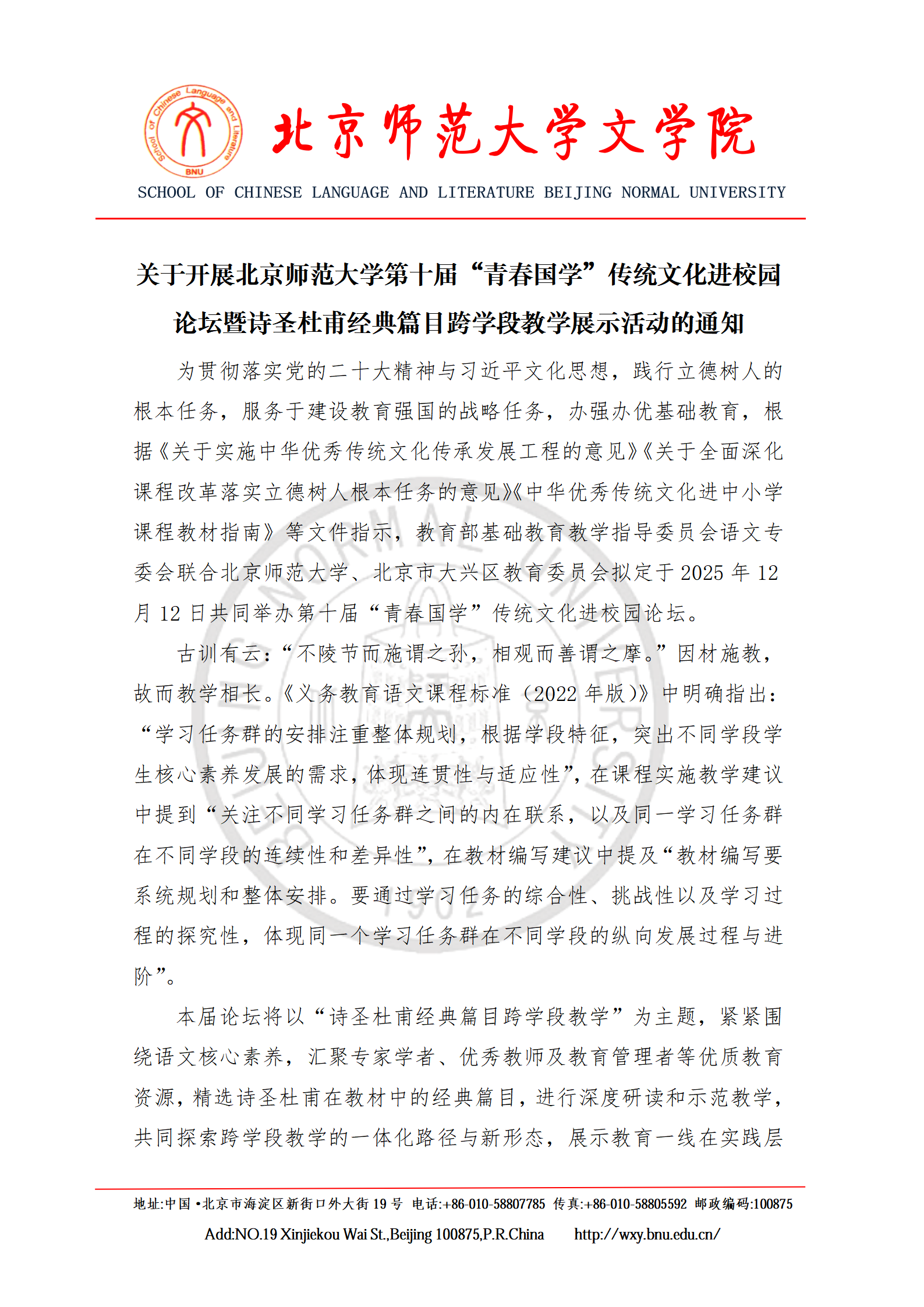 关于开展北京师范大学第十届“青春国学”传统文化进校园论坛暨诗圣杜甫经典篇目跨学段教学展示活动的通知