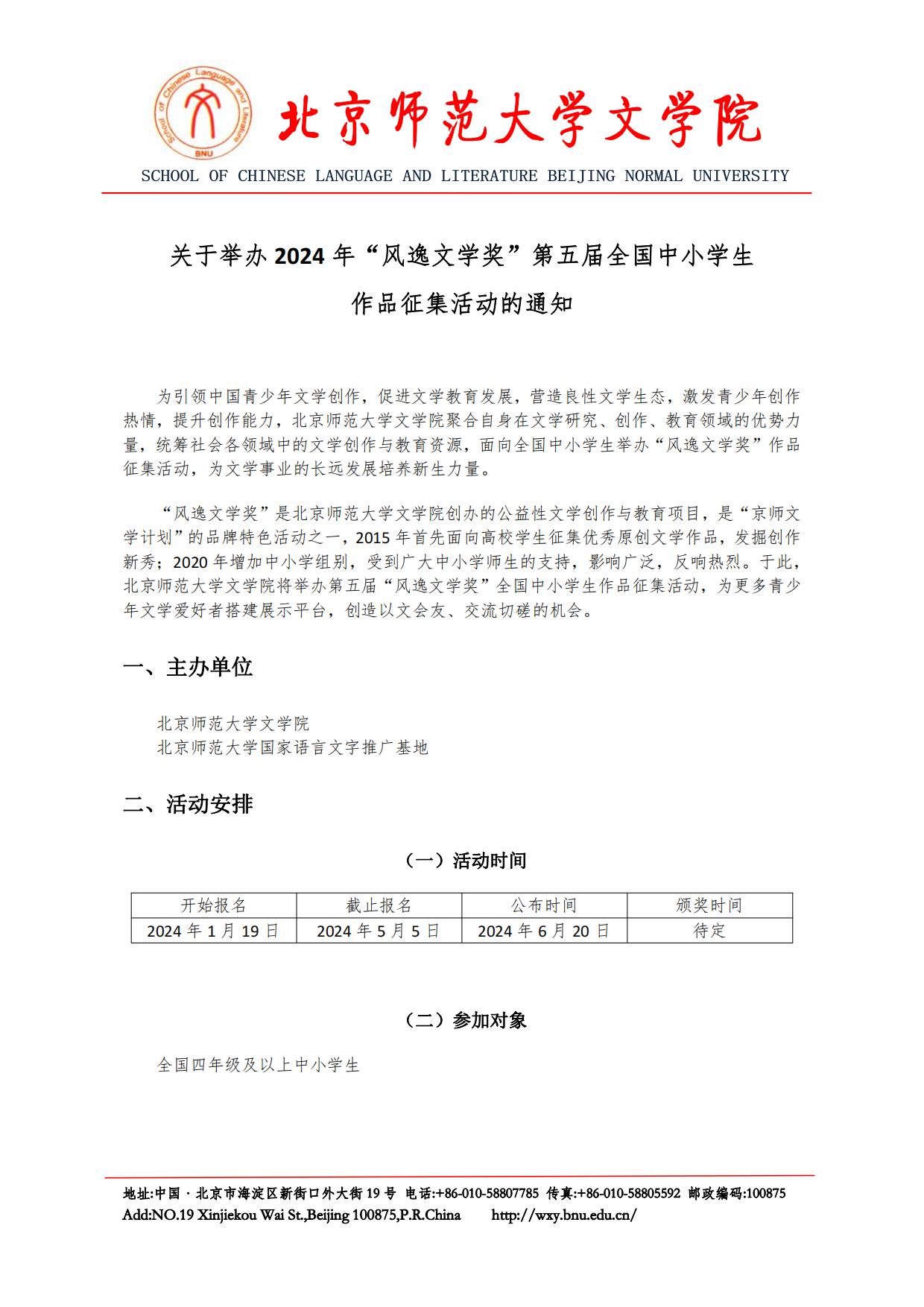 关于举办2024年“风逸文学奖”第五届全国中小学生作品征集活动的通知