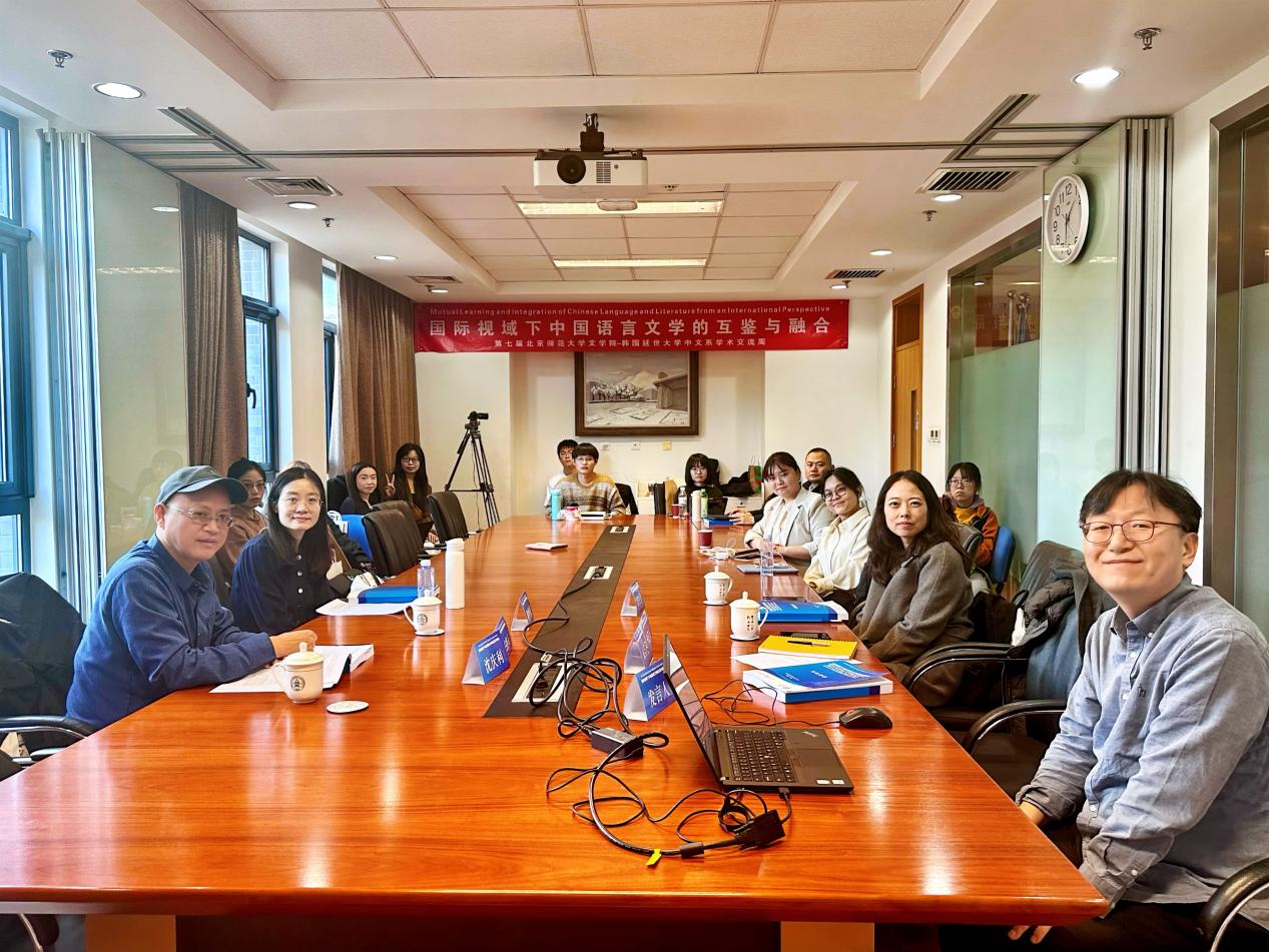 、延世大学中文系的12位专家学者、32位博士研究围绕各分会场主题分享了研究成果,百余名中韩师生参加了此次交流活动。与会人员围绕中国语言、文学和文化的互鉴与融合进行了热烈讨论。 第一分会场围绕“古代汉语”展开讨论。第一场由延世大学金殷嬉老师主持。金殷嬉老师题为《〈韩国汉字字典〉收录国字人名用字的异体字探析》的报告,重点讨论了韩国古文献或文件中在人名用字上使用异体字的情况,以及韩国人名用字异体字的字头收录和整理问题。北京师范大学齐元涛老师题为《论西方汉字研究的历史分期》的报告,梳理了西方汉字学三个时期的研究史,探讨了西方汉字研究为汉字学研究提供的新命题、新方法、新观点。延世大学严允珠同学的报告题为《中古音疑母变化形态考察——以〈中原音韵〉为依据》,考察了疑母字从中古到现代普通话的演变规律。北京师范大学赵明同学的报告题为《〈说文〉䇂、辛二形在殷周时期的构意》,搜集“䇂”“辛”及其参构字在殷周时期的相关形体,通过形体离析和字组系联确定了二字的构意。 第二场由北京师范大学齐元涛老师主持。延世大学王玥璐老师的报告《以人际关系为基础的语气词“啊”的语素变体使用情况考察》,在传统语言文字研究的基础上,通过社会语言学方法考察了语气词“啊”“呀”“哪”“哇”的不同语用功能。北京师范大学孙凌康同学的报告《〈庄子·大宗师〉“彼方且与造物者为人”训诂辨正》,辨析前人对“彼方且与造物者为人”句的成说,结合《庄子》内证确定其词义。延世大学苏天潇同学的报告《从19世纪中期的传教士粤语文献看粤语的下阴入》,考察了《英华分韵撮要》中下阴入被误认为阳入的情况,探析了19 世纪中期粤语下阴入的发展情况。北京师范大学邹梦然同学的报告题目是《论唐诗〈诗经〉用典的隐含意义——以杜甫诗歌为例》,以杜诗为例,探讨了《诗经》用典隐含意义的类型和生成过程。两场分别由齐元涛老师、金殷嬉老师评议。 第二分会场围绕“中国古代文学与神话学”展开讨论。第一场由延世大学朴炫柱老师主持。延世大学朴炫柱老师的报告《文学地理学视域下的唐传奇与唐长安关系考察——以〈任氏传〉为中心》,从文学地理学视域出发考察长安与唐代传奇作品的关系,探索长安城的实际空间如何被纳入文本,并生成虚拟的幻想空间。北京师范大学诸雨辰老师的报告《〈文海指针〉与清代文章学的异域建构》聚焦明治时期日本汉学家川田刚编选的《文海指针》,探讨异域文化视野下的清人文统构建,以及这些被遮蔽的传统最终如何回流进入清人批评视野,如何参与到清末民初想象晚明的文化思潮之中。延世大学黄多晶同学的报告《典故之镜:辛弃疾词中的用典艺术及其内面世界》,系统剖析辛弃疾词作中的典故运用,探讨其在表达主题、塑造意象、构建情感等方面的独特作用。北京师范大学王亦玮同学的报告《从“观看”到“体物”:宋诗中的新晴书写》,着眼于宋人对“新晴”书写传统的突破,指出其对天人关系的进一步思考,揭示出宋人面对自然时由“观看”到“体物”的观照模式与审美方式的转变。 第二场由北京师范大学诸雨辰老师主持。延世大学朴钟洙同学的报告《缠足女神:〈列国前编十二朝传〉中的女娲神话重构研究》,探讨了明末的上古史演义《列国前编十二朝传》中的女娲神话在商业木刻印刷术这一物质背景下流通与重构的过程。北京师范大学曾赖碧同学的报告《晚明松江雅社对竟陵派的攻讦》,梳理了松江雅社的成立过程及其对竟陵派的批评,呈现了“后七子”对松江地区和晚明山人的深刻影响。延世大学罗柔理同学的报告《李白赠内诗中的夫妻情感观研究》,通过分析李白赠内诗的不同用语和意象,探讨其对妻子许氏与宗氏的感情。北京师范大学孟琳峰同学的报告《作为知识商品的神话:自媒体中神话解说的知识生产与消费》,探讨了消费主义语境下自媒体中神话解说的知识生产与消费共同创造了全新的神话图景。两场分别由诸雨辰老师、朴炫柱老师评议。