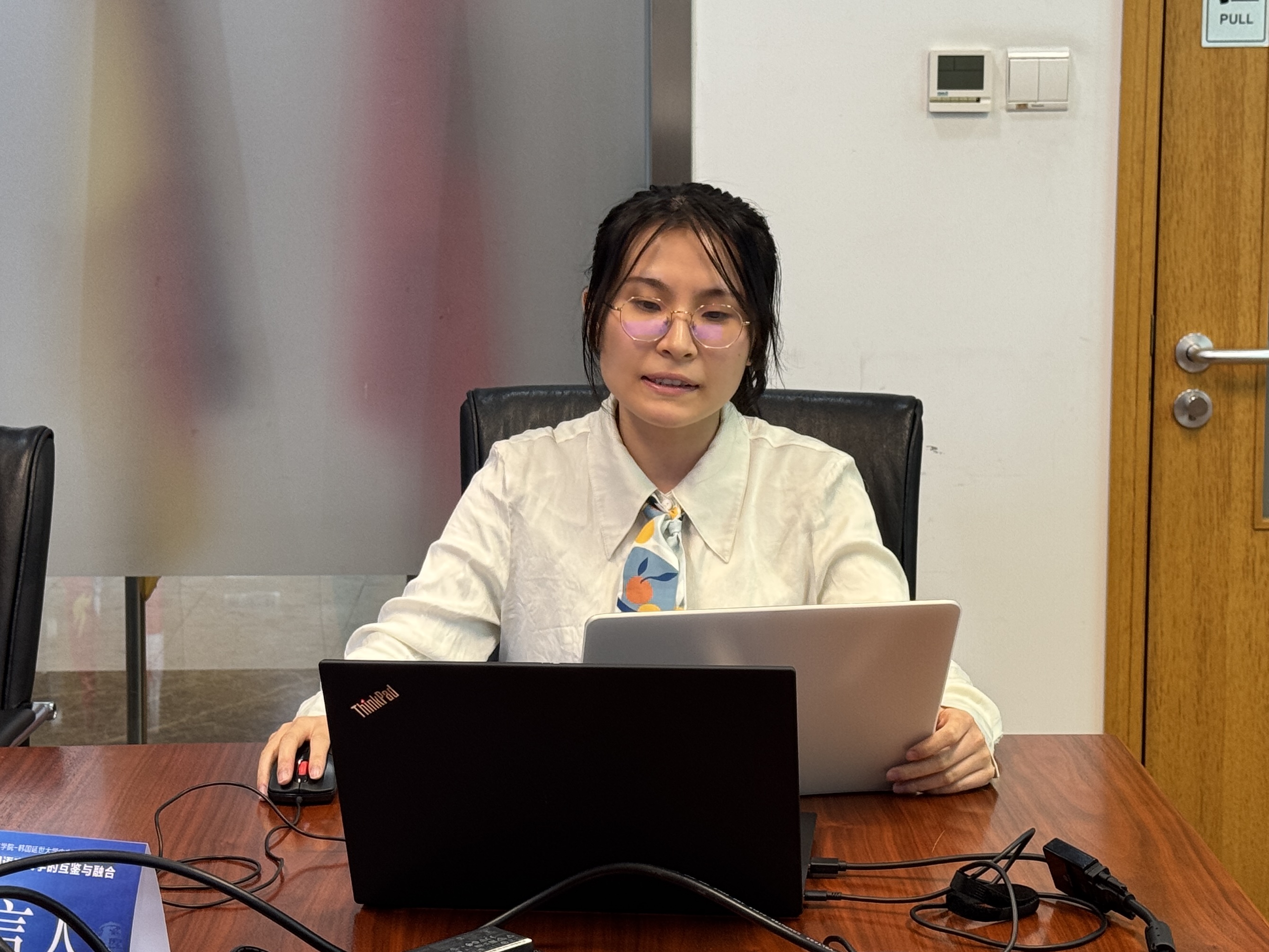 在研讨会后的总结环节,会场老师进行了全面的总结。齐元涛老师强调了国际视野下借鉴与融合的重要性,并表达了今后不断交流的愿望。韩国延世大学朴炫柱老师也对此次学术交流的热烈气氛和学生间的活跃互动给予了肯定。诸雨辰老师通过引用中国古代诗人谢灵运的诗句“谁谓古今殊,异代可同调”,强调了古代文学和神话学在古今中外文化交流中的关键角色,深刻诠释了本次中韩学术交流“互鉴融合”的主题。孙银新老师从理论研究和语言实践两个角度,总结了中韩学者在汉语研究和文学领域的深入交流与合作。他强调,关注汉语走向世界、借鉴西方理论研究,充分体现了中国语言文学研究的国际视野,具有鲜明的时代气息。延世大学李宝蓝老师分享了本次研讨的收获,认为中韩学者不同的视角和研究方法为双方带来了新的启发。