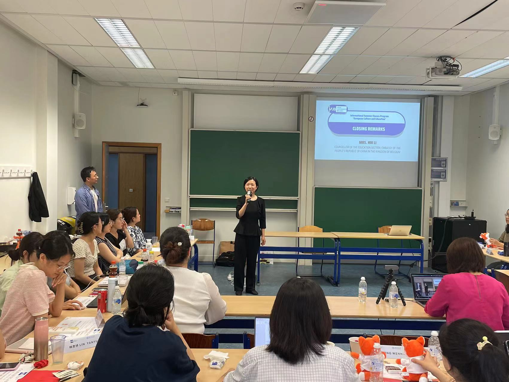 黎惠参赞最后发表结业致辞。黎惠参赞首先祝贺课程班的同学们学有所成并圆满结业,不仅收获了知识,还结交了友谊、开拓了视野;黎惠参赞接着对国际课程班的主办方和授课教师表示诚挚的谢意,特别是感谢诸位老师们的辛勤付出;黎惠参赞随后表示,她十分高兴能在比利时与各位北师大的师生相遇,希望日后能有更多的机会进行深入的交流,也期待同学们在保持家国情怀的前提下增强国际对话的意识;黎惠参赞最后祝所有师生归途顺利,一切圆满。结业仪式在热烈的掌声中落幕。