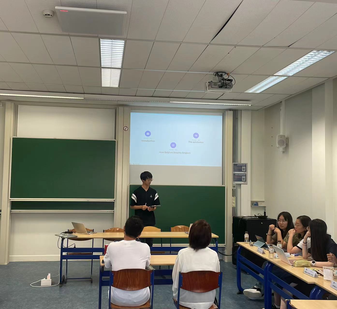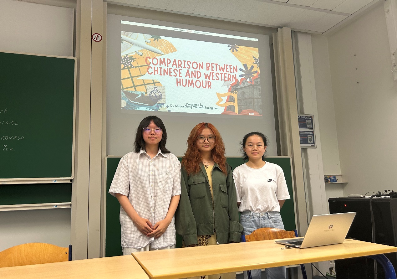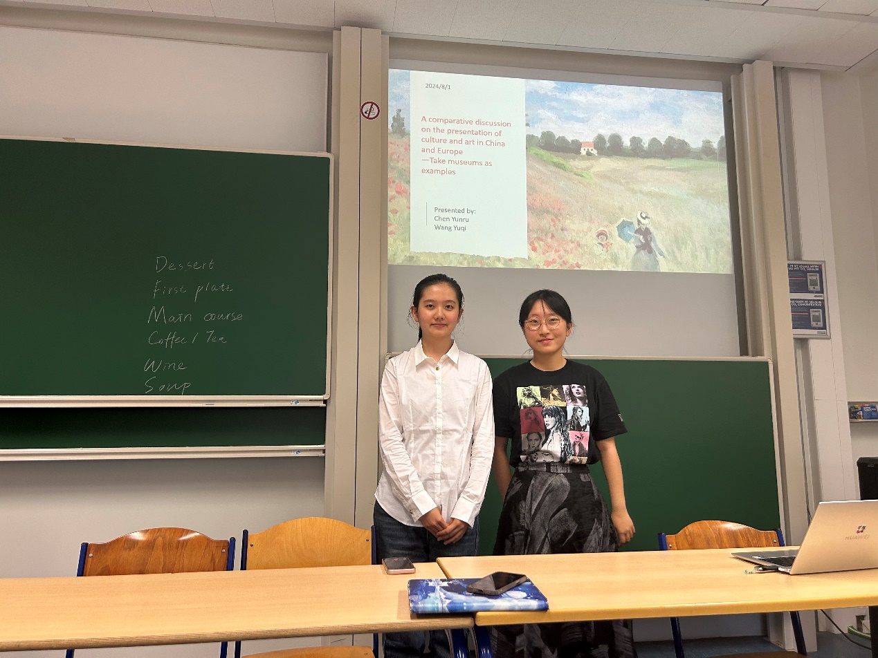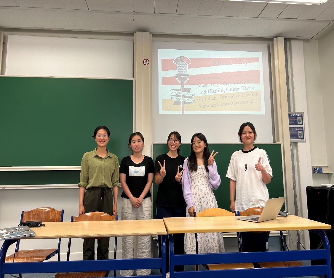 国际课程班采取分组研讨与合作的形式进行交流。同学们以小组为单位,围坐在一起,进行自我介绍和实时互动。最终的课程成果展示方式也采取了小组合作完成并汇报的形式。同学们彼此之间的距离逐渐拉近,本硕博的学制壁垒也被打破,加深了彼此之间的了解,提升了集体协作的意愿和能力。在最后的小组成果展示环节,各组分别围绕中欧音乐艺术节的比较、东西方绘画方式的比较、中欧女性生活方式比较、中法餐饮文化比较、中西“幽默”概念比较、中欧博物馆的比较、比利时的民族国家概念等话题,进行成果汇报,并在老师的指导下,高质量地完成了课程论文。