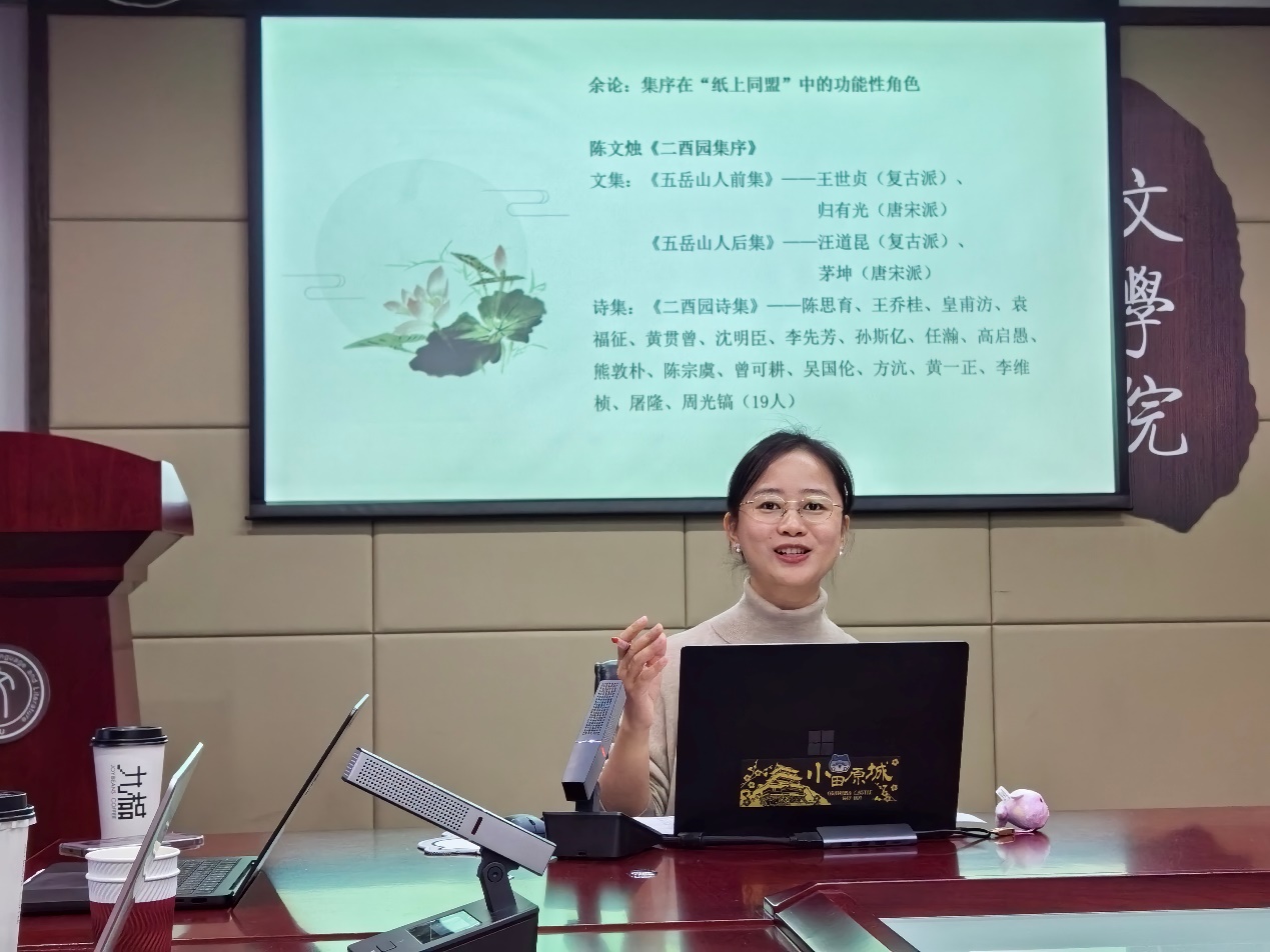 胡媚媚主要关注清代文人的结社活动及诗学观念。“社”作为级别很高的文学活动,参与者表现出相近的诗学宗尚和审美追求。清代诗社数量很多,形成了稳定的诗人群体,社诗总集数量也远超前代。胡媚媚进而陈述了清代诗社的基本面貌和结社方式,涉及社诗总集、结社主体、诗歌创作、唱和形式等等。清初文人常常通过集体创作进行交游、学习,再从中脱颖而出。大体而言,清诗创作呈现出个性被群体性笼罩、遮盖的倾向。至于功能性书写,胡媚媚认为清代社诗创作的功能性并不明显。明末清初的结社带有政治抗争性,随着遗民群体的消失,诗社也很快转向文学性、艺术性、娱乐性更突出的活动。不过,诗社总集的序跋的确包含诸多功能性书写。最后,胡媚媚借助具体事例,进一步阐释了清代结社集会对诗歌题材、诗学观念和地域文学传统的形成等多方面的影响。 讨论环节,各位老师基于不同时代文人集会的现象进行进一步探讨,也对评议环节涉及的问题进行回应。陈济川以苏轼的悼亡文学为例,区分了悼亡诗、悼亡词和悼亡文三者的内容和功能差异,肯定了从抒情角度理解诗歌的合理性,同时认为应将功能性作为诗歌抒情性研究的补充。王润英对文学集团的政治性目的问题进行补充,阐明文人如何用书写打破和重建秩序。此外,通过对比题画诗和京剧中程式化所受的评价差异,提出未来或许可以发展出新的评价体系来理解明代的文学复古。同时,王润英也联想到了文体功能的流动性问题,书序文承载着评判的权力,然而一旦脱离语境,书序文建立的秩序很可能被诗文评打破和取代。复旦大学古籍所龚宗杰认为考察诗歌程式化的特点,或许能帮助我们更清晰地理解明代文人集会与固定场合下的特定创作。关于明清时期文人对前代文学传统的承袭,龚宗杰引出“文学记忆”这一概念。已有文本留下某种文学记忆,后来的创作或是推翻既有,或是受既有的启发。明人通过不断模仿和追忆前代典范,产生自己的作品。文人集会结社实际就是在固定的场合内,通过固定主题,要求作家以类似的手法表达相近的内容。明清文学具有社交性特征,集体性和功能性也反过来要求文人创作更具有规范性。规范性中,汇聚了文本的过去和将来,也更吸引学者去关注文本的技法和程式。 最后,吴沂澐进行总结,归纳了各位与会学者对于“诗可以群”这一概念在社会、政治、文化研究方面的延展性。同时,与会学者一致认为,本次议题仍留存有较大的阐释空间,因此决定在明年继续举办关联议题的工作坊,进一步细化、深化文学功能性的研究范式。 (撰稿:张语诺,摄影:颜子楠)