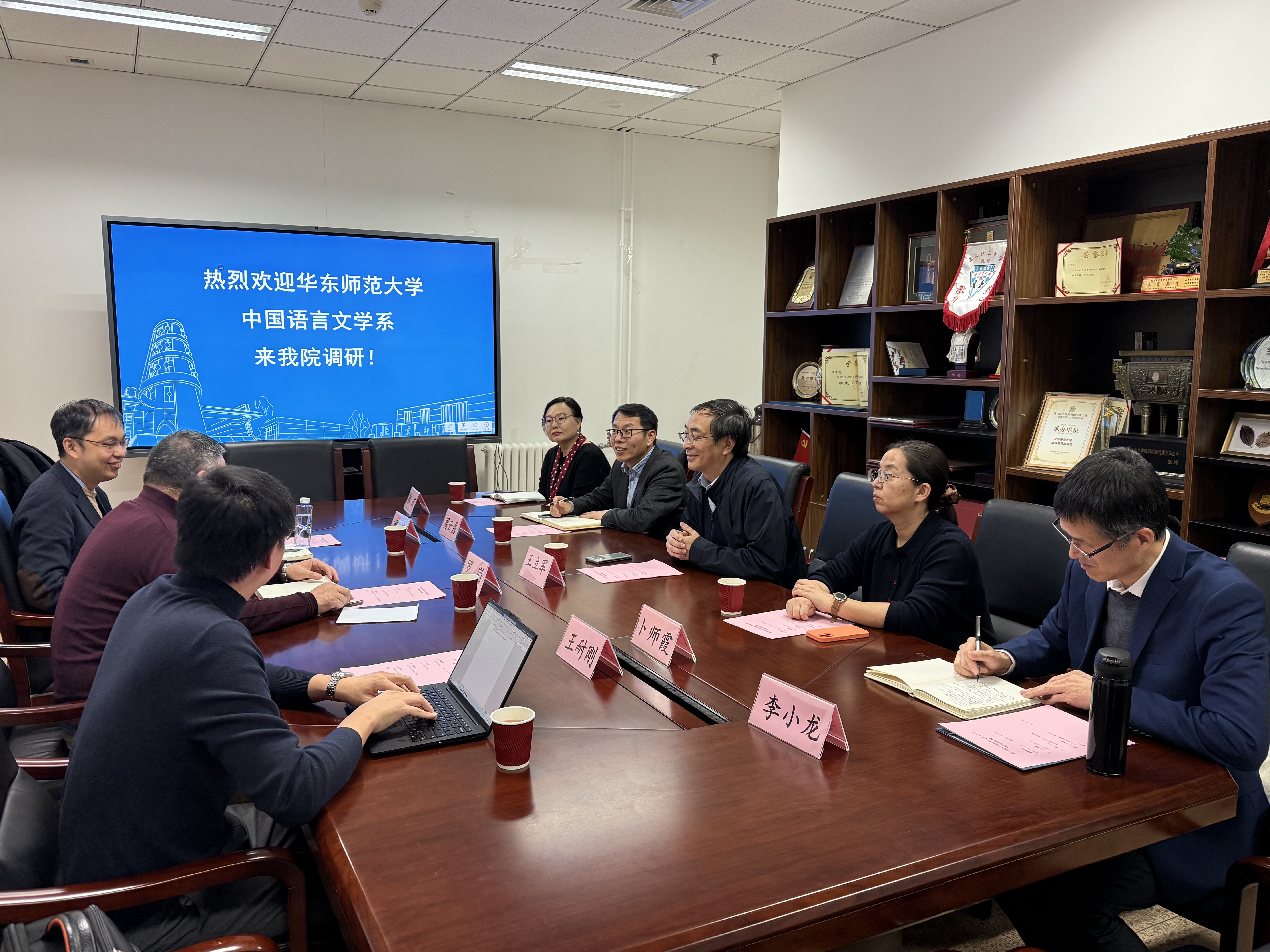 2025年12月26日下午,华东师范大学中国语言文学系系主任罗岗、副系主任黄平、系主任助理王耐刚一行3人前来bet365最新网址 调研。交流会由院长王立军主持。